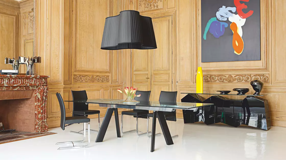 Piétement métal chromé. Surpiqures ton sur ton, hauteur d’assise 49cm.