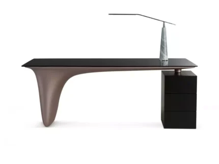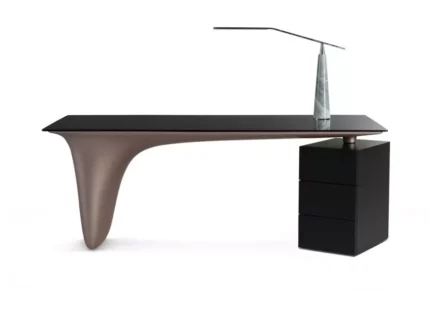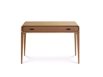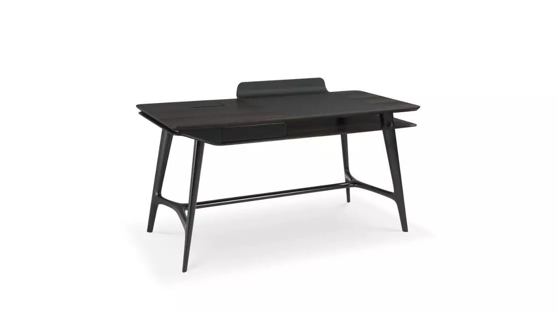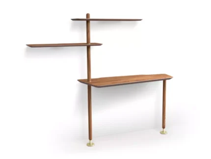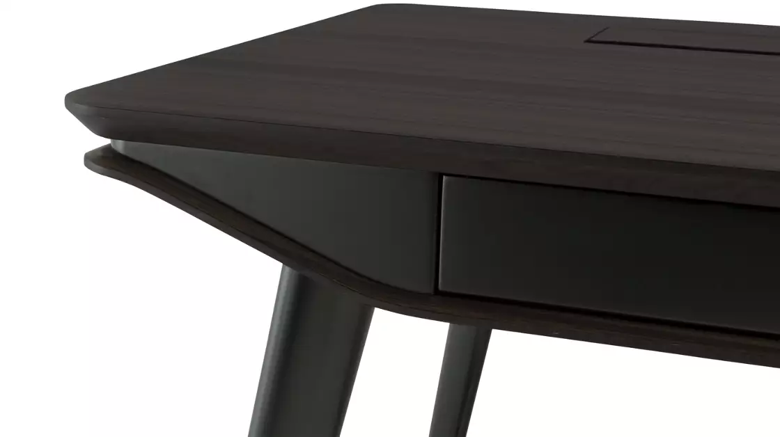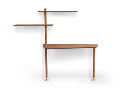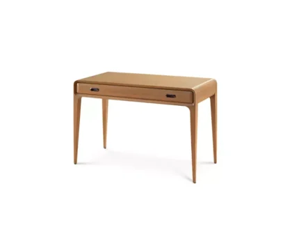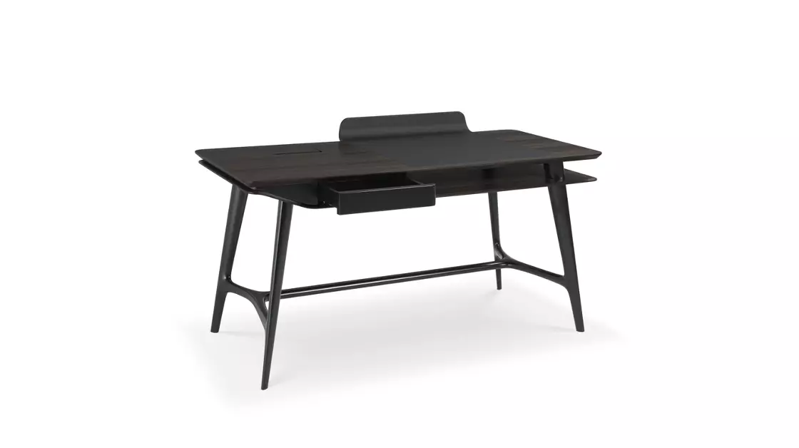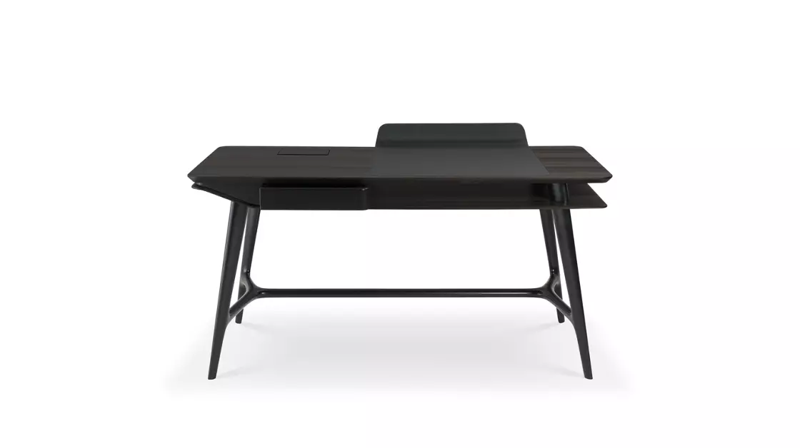 Bureau d’appartement, Arial fait dialoguer deux plateaux en bois biseautés. L’espace qui les sépare abrite une niche et un tiroir (à gauche ou à droite) jusqu’à ce qu’ils se rejoignent en un élégant mouvement de vague.