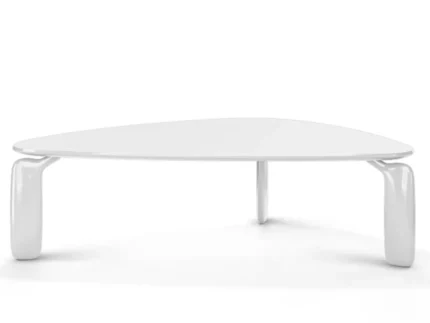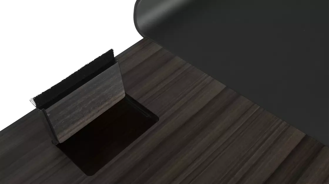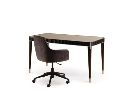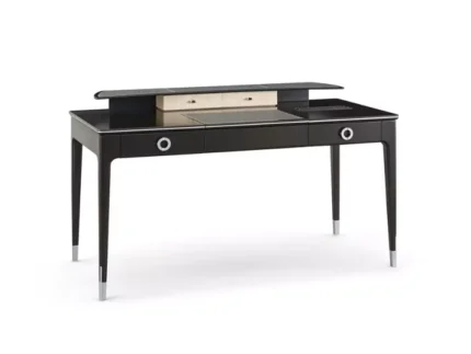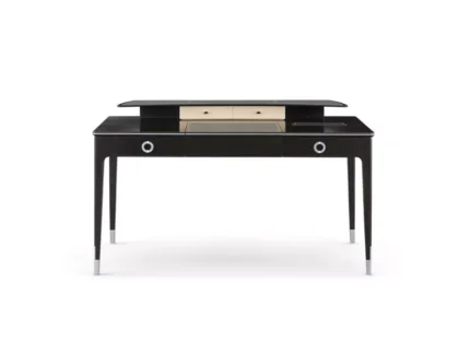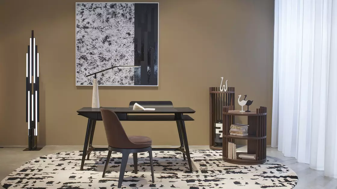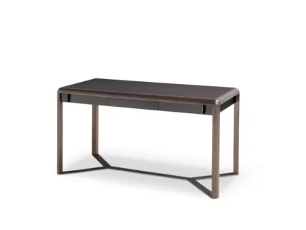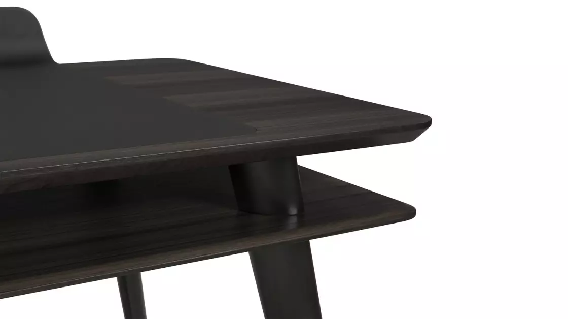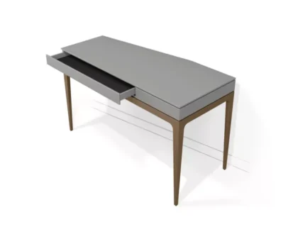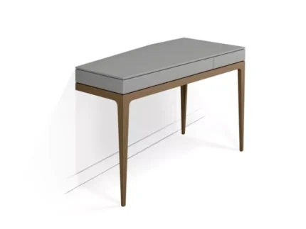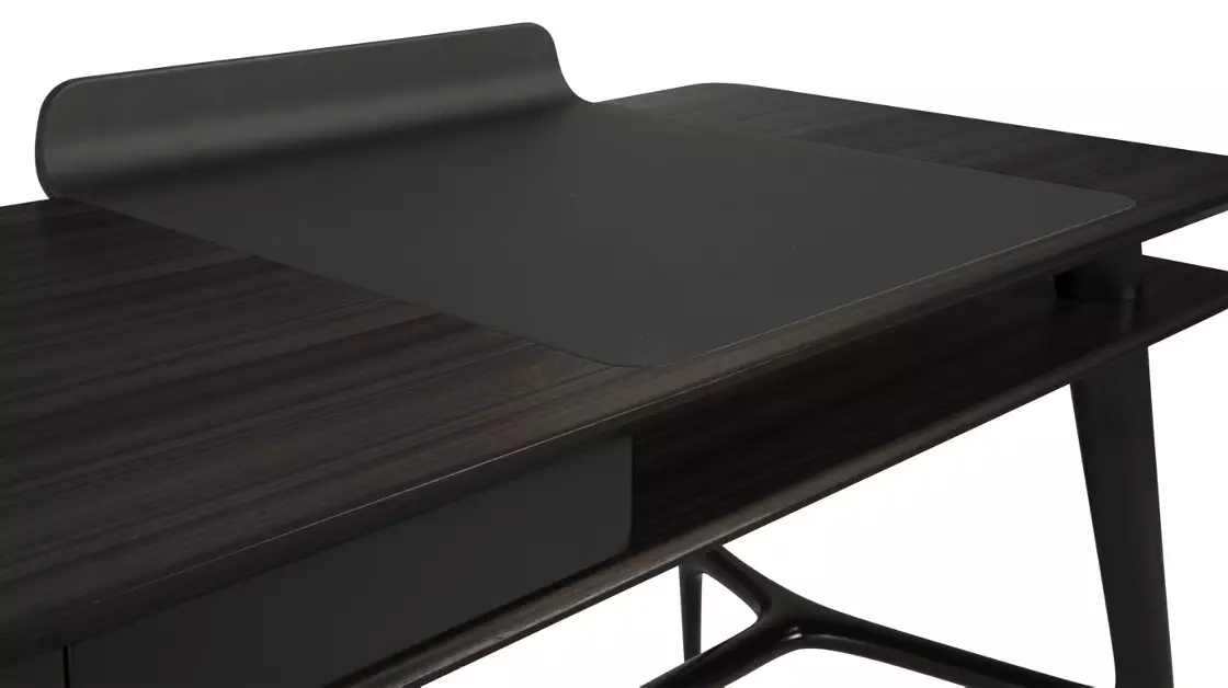 Bureau d’appartement, Arial fait dialoguer deux plateaux en bois biseautés. L’espace qui les sépare abrite une niche et un tiroir (à gauche ou à droite) jusqu’à ce qu’ils se rejoignent en un élégant mouvement de vague.
