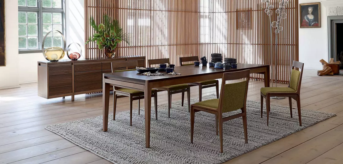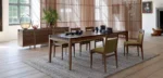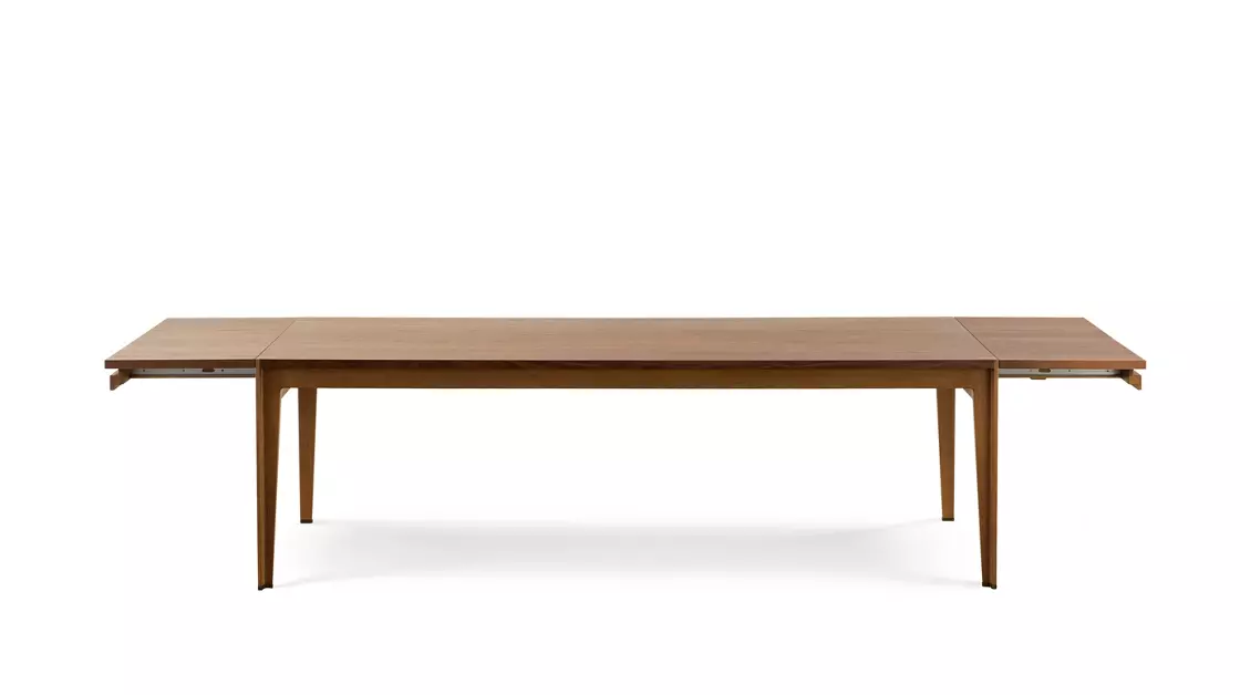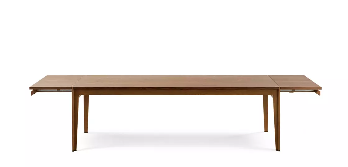 La table de repas dissimule à chaque extrémités 2 allonges et reprend les beaux détails d’encastrement caractéristiques de cette collection.
