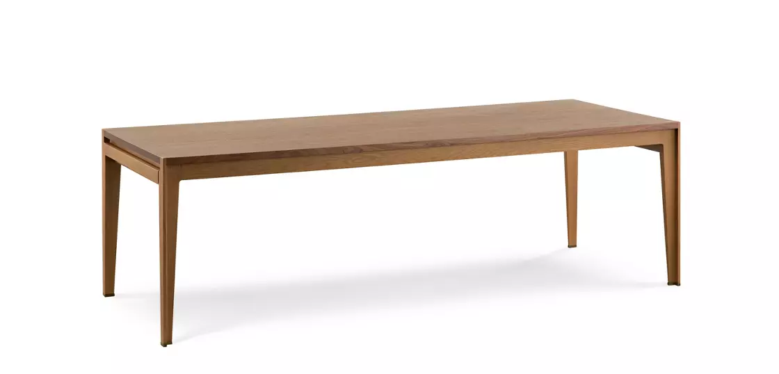 Structure en chêne massif et panneaux de fibres de moyenne densité plaqué noyer américain. Sabots en acier Bronze Oxydé.2 allonges de 48 cm avec coulisses métalliques.