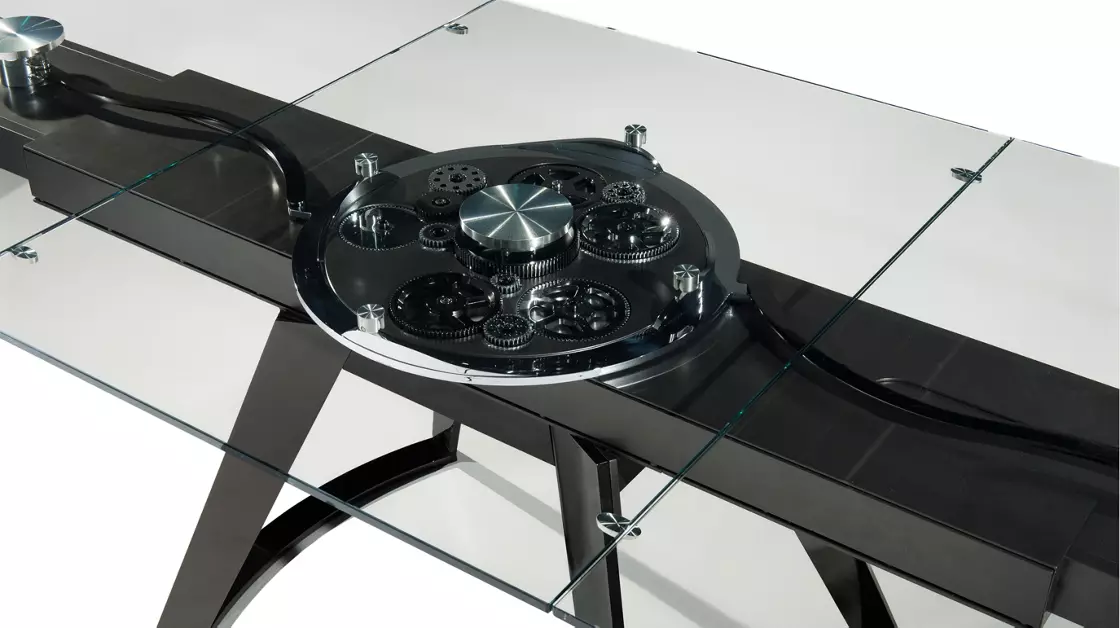 Table de repas avec une allonge de 80 cm, motorisée avec mécanisme type horloger à engrenages apparents (batterie incorporée, télécommande). Plateaux verre trempé épaisseur 12mm. Poutre en acier et aluminium laquée Champagne et piètement en acier Nickel satiné.