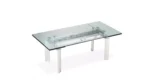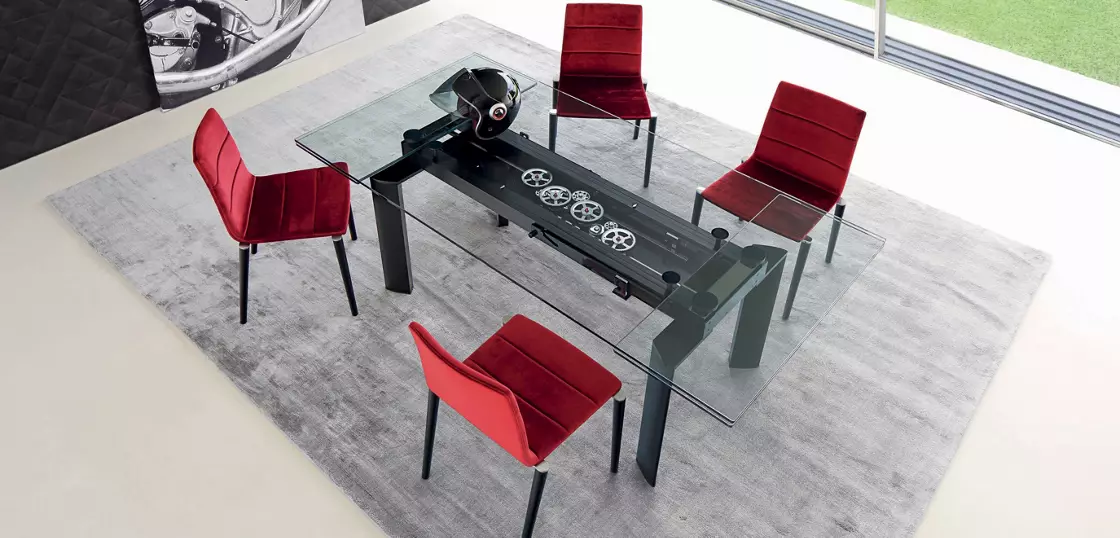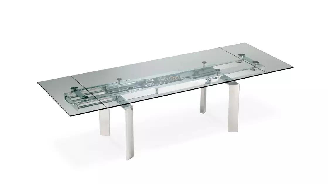 Table de repas avec plateau et deux allonges de 40 cm en verre trempé (ép.12 mm) motorisées avec mécanisme à engrenages apparents.