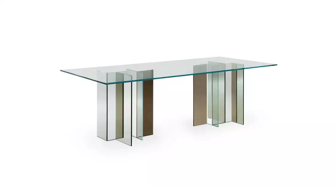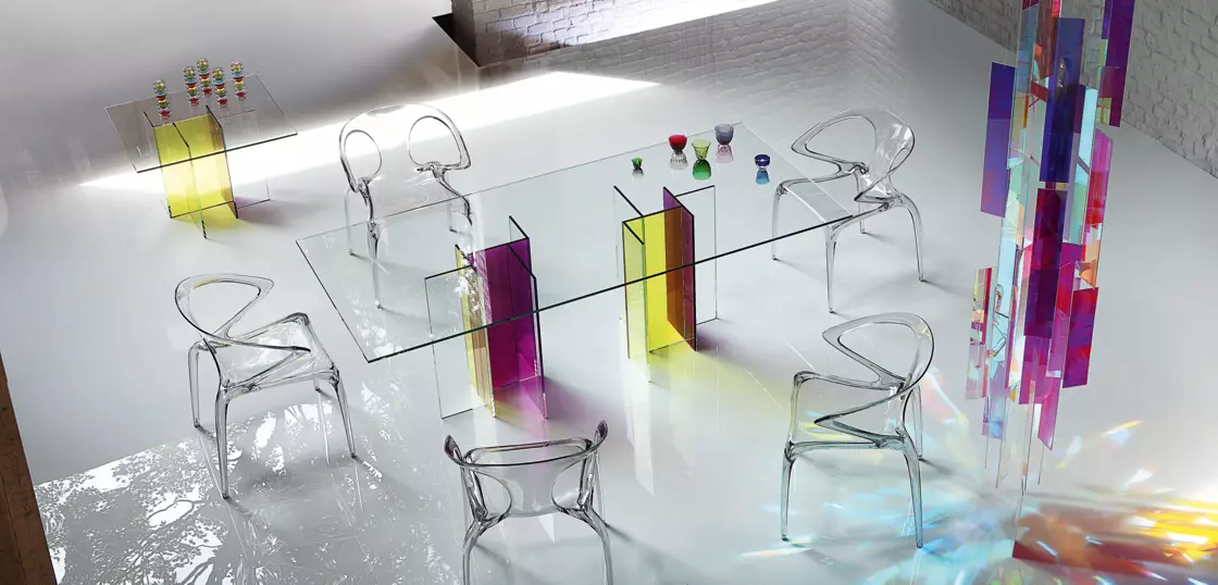 Table de repas avec plateau en verre extra clair trempé 15 mm. Piétement en verre feuilleté collé épaisseur 12 mm coloré ou stop sol et verre clair. Disponible dans différentes harmonies.