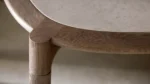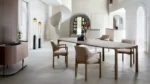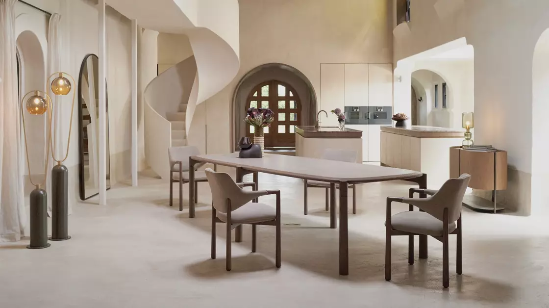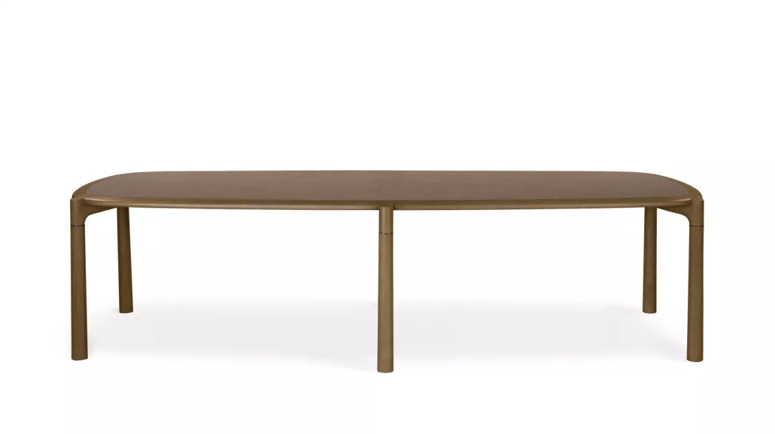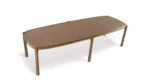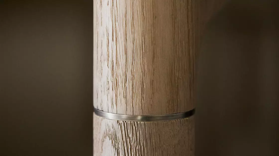 Plateau en panneaux de fibres de moyenne densité (3 finitions possibles) avec emboiture chêne massif défibré. 6 Pieds chêne massif défibré avec applications en Inox finition Onyx ou Fer Noir Martelé.