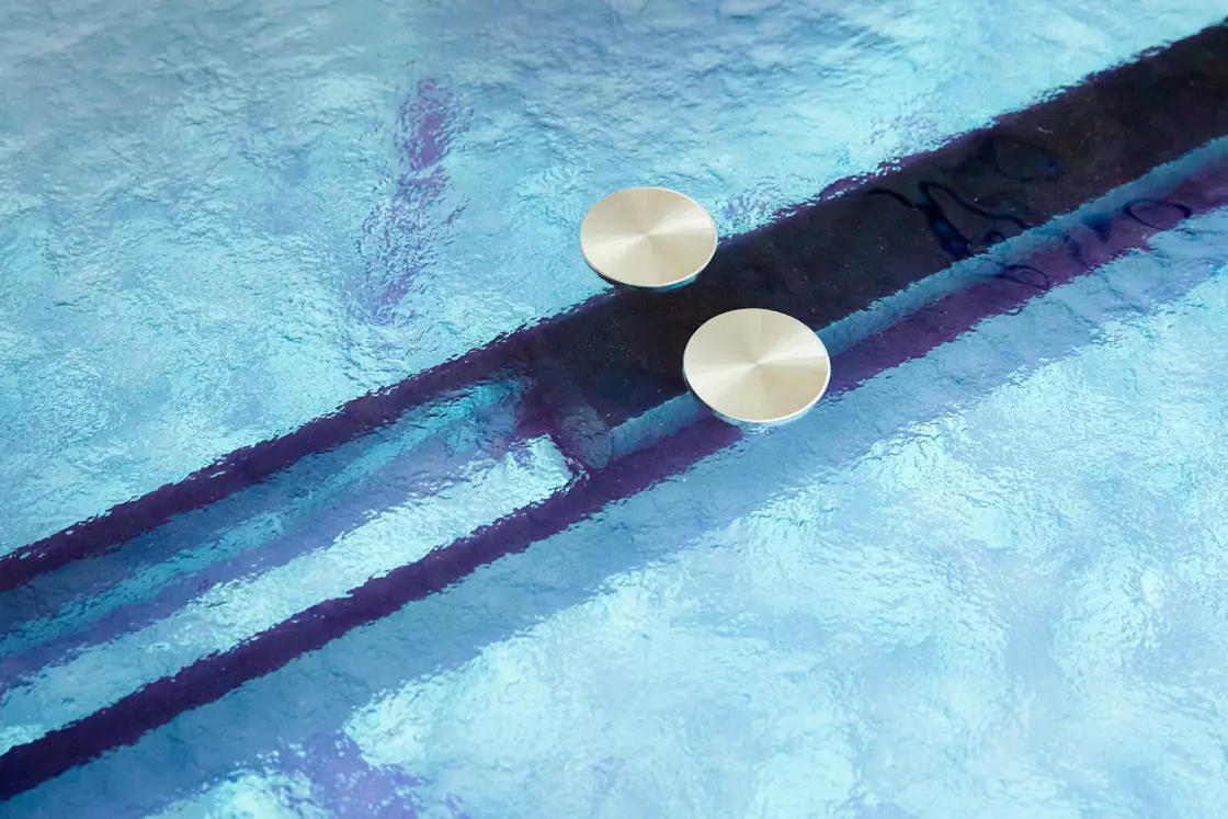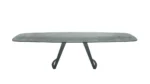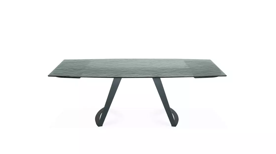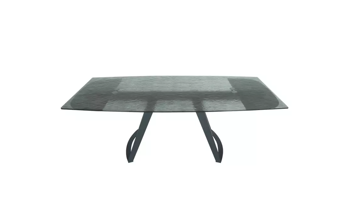 Table repas avec un plateau semi-elliptique et 2 allonges de 40 cm en verre recuit bullé, trempé ép.12 mm. Piètement en acier laque mate époxy et traverse en aluminium laqué (plusieurs coloris).