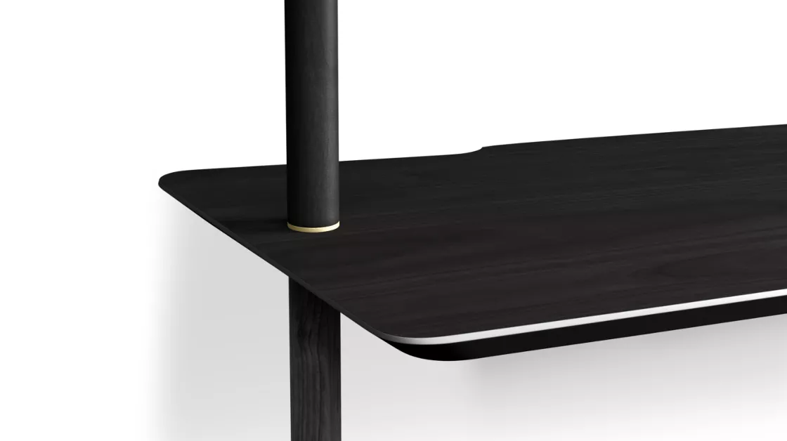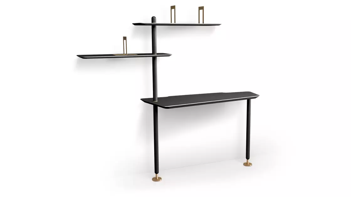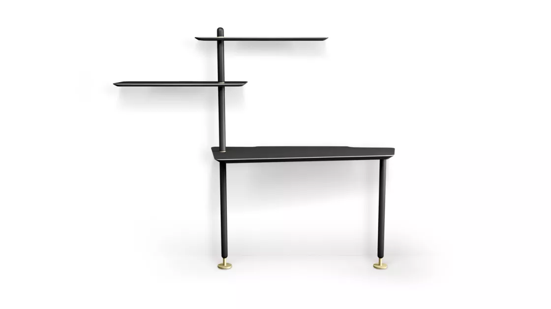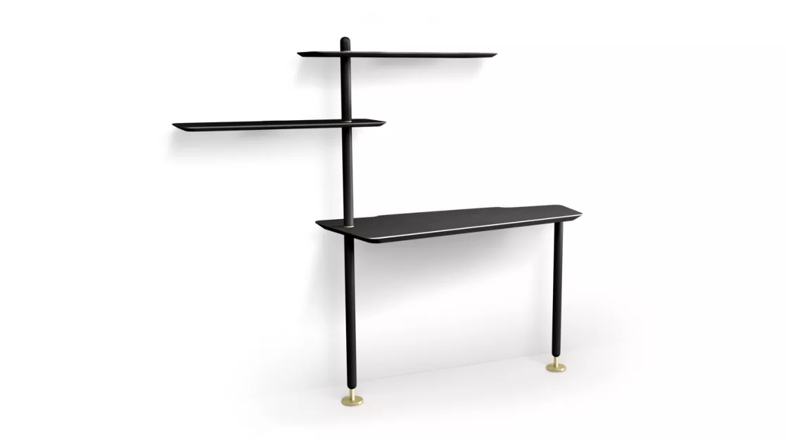Bureau avec plateau trapézoïdal et deux étagères en panneaux de fibres de bois de densité moyenne plaqués noyer américain sur mâts en noyer. Bases et fixation murale en acier laqué (différentes finitions).