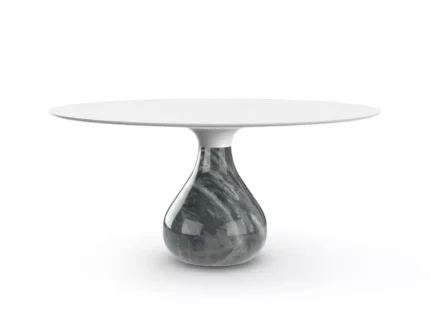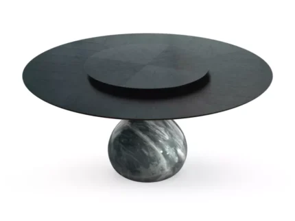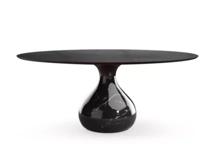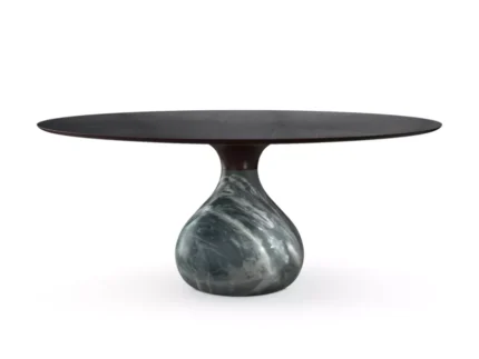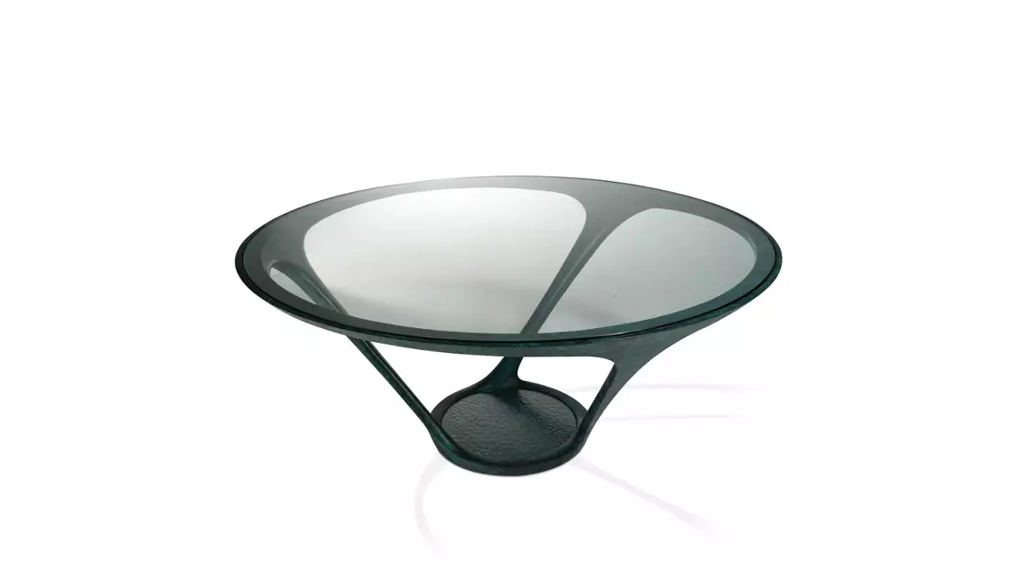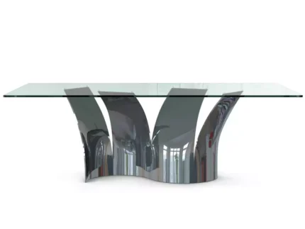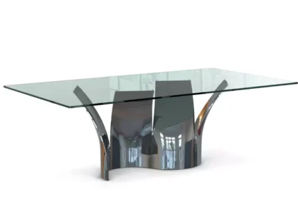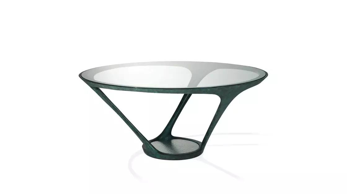 Table de repas réalisée en bronze coulé à la cire perdue, finition bronze doré ou vert antique. Plateau en verre clair trempé épaisseur 10 mm, base avec plateau de verre bullé. Série limitée à 15 exemplaires numérotés de chaque finitions