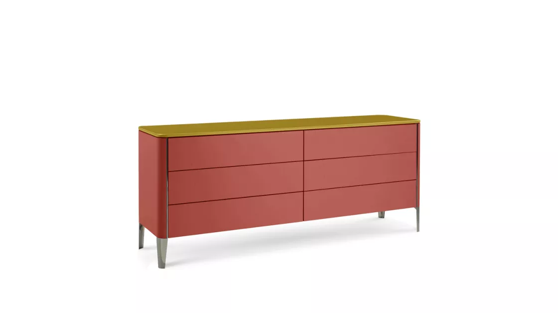 Commode 6 tiroirs réalisée en panneaux de fibre de densité moyenne laqué (mat ou brillant) ou plaqué Alpi® (placage reconstitué) avec un plateau au choix en laque mate ou brillant, en verre laqué, en placage Alpi® ou en céramique. Pieds galbés en acier chromé noir.