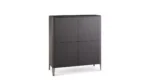 Vaisselier 4 portes réalisé en panneaux de fibre de densité moyenne laqué (mat ou brillant) ou plaqué Alpi® (placage reconstitué) avec un plateau au choix en laque mate ou brillant, en verre laqué, en placage Alpi® ou en céramique. Pieds galbés en acier chromé noir.