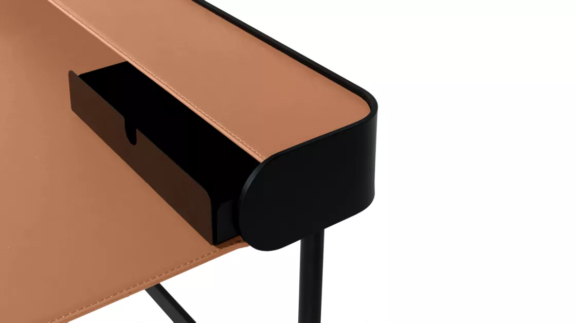 Bureau avec structure composée d’un piètement et réhausse en acier laqué noir. Plan de travail et étagère en multiplis de bouleau revêtus de referente de cuir (nombreux coloris). Petit tiroir métallique en acier laqué noir.