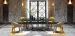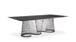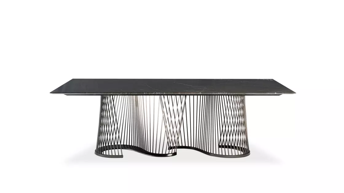 Table de repas avec piétement composé de 96 tubes d’acier finition chrome Noir disposés en éventail sur une base en acier satiné. Plateau en marbre (5 possibilités).