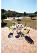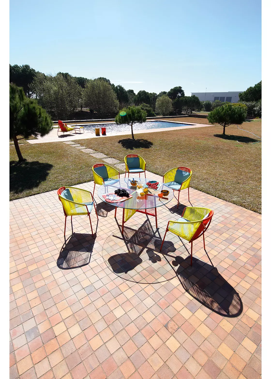 Table repas à structure laquée époxy corail et fils de polyéthylène rouge et jaune, plateau métal perforé.