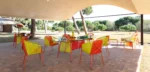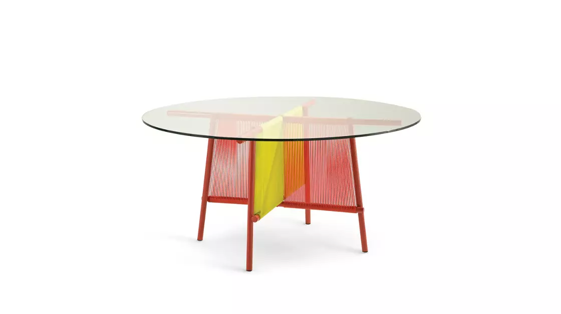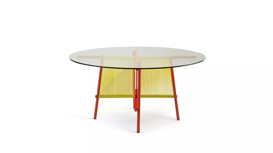 Table repas à structure laquée époxy corail et fils de polyéthylène rouge et jaune, plateau verre clair 12mm.