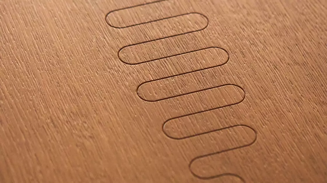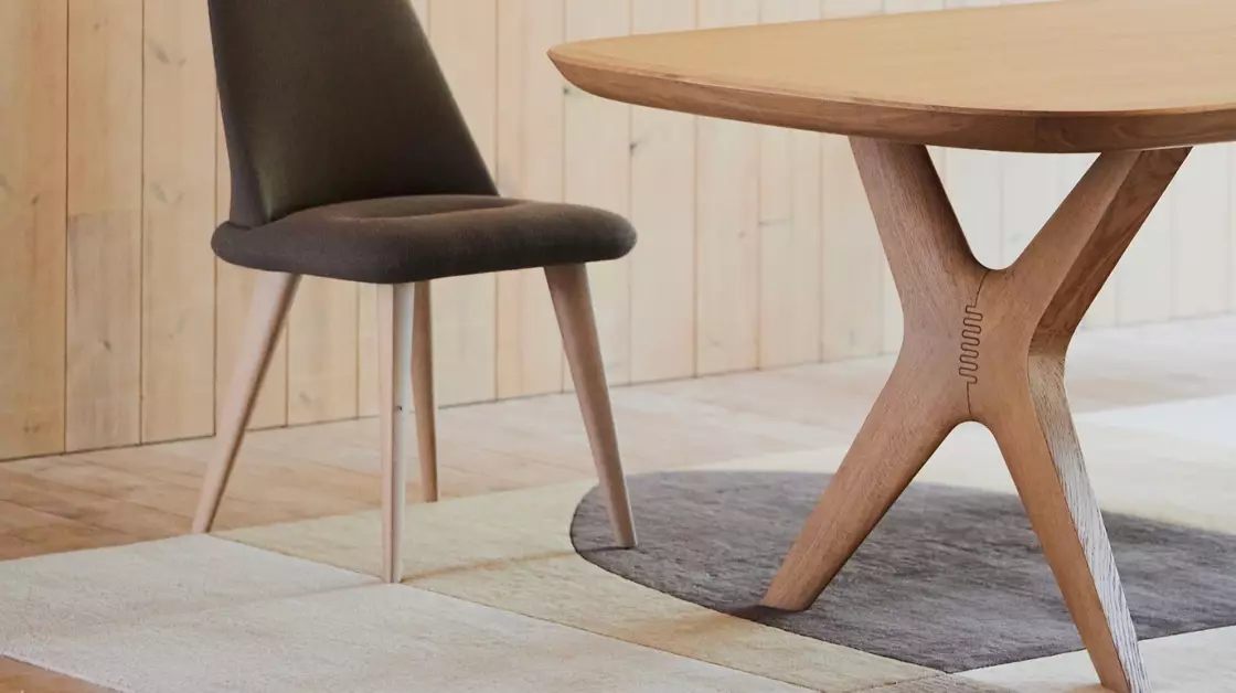 Toujours à la recherche de beaux détails d’ébénisterie Sacha Lakic a imaginé la collection Whisper avec sur son piètement un frisage de chêne massif réuni par de délicats assemblages soulignés par une légère gravure. Ce détail se retrouve également sur son plateau.