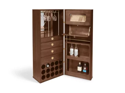 2 portes latérales bois avec 2 étagères vitrées amovibles (taquets), 2 portes centrales bois ‘soleil’ avec 1 étagère amovible (taquets) revêtue de revêtement synthétique, éclairage LED à l’intérieur avec senseur. Structure en panneaux de fibres de moyenne densité plaqué merisier, plateau merisier massif avec emboîture merisier massif, piétement merisier massif.