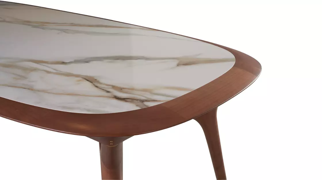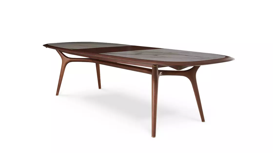 Telle une voile tendue sur ses mâts, le plateau de la table de repas semble s’enrouler autour de ses quatre pieds. L’insert central en céramique aspect marbre est aussi décoratif que pratique.