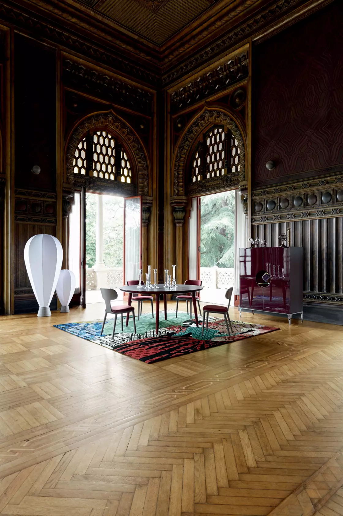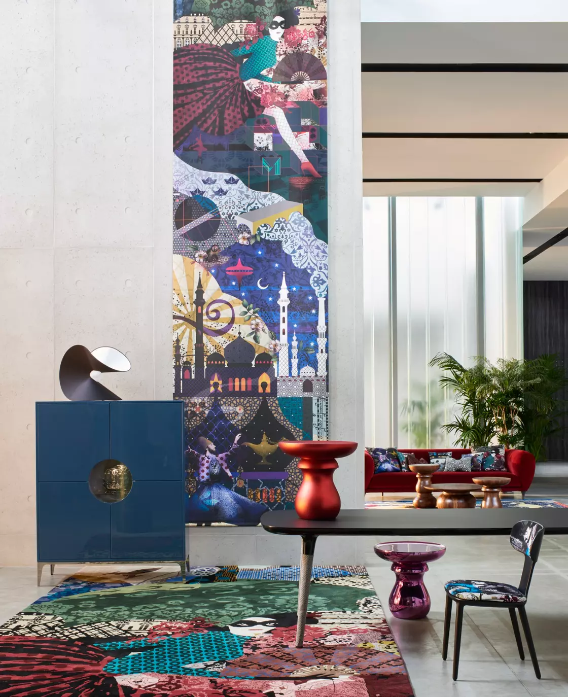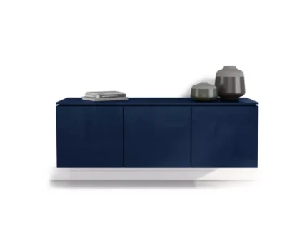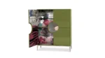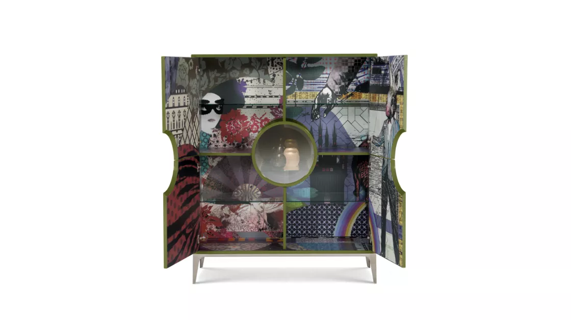 Cabinet 4 portes réalisé en panneaux de fibres de moyenne densité finition laquée Haute Brillance à l’extérieur, intérieur imprimé avec le motif exclusif Artwork mat ou Haute Brillance. Vitrine centrale éclairée (2 finitions possibles) avec télécommande. Piétement acier inox poli (autre finition possible).